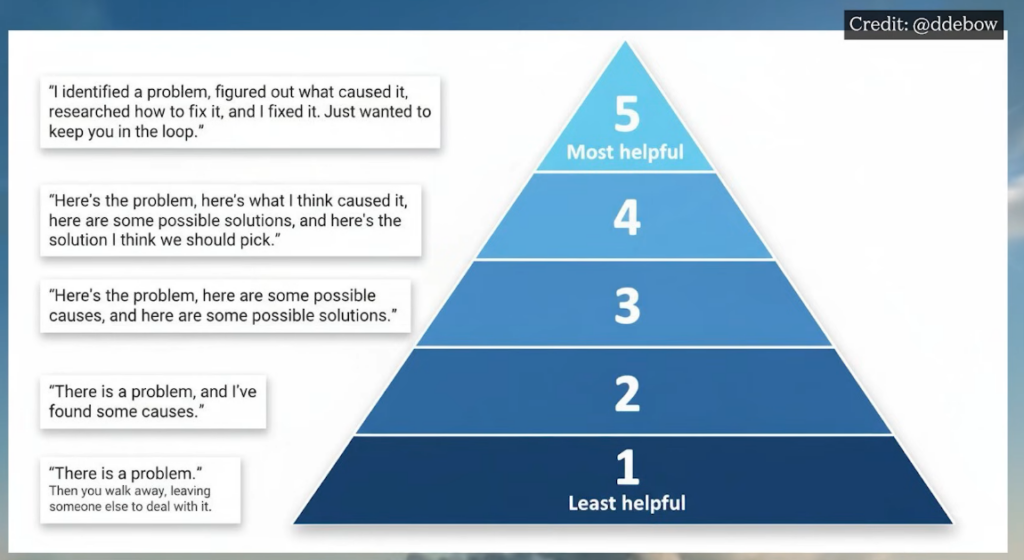 One of the clearest ways I’ve seen this articulated is Daniel Debow’s Helpful Hierarchy — a simple pyramid that ranks responses from least helpful to most helpful.